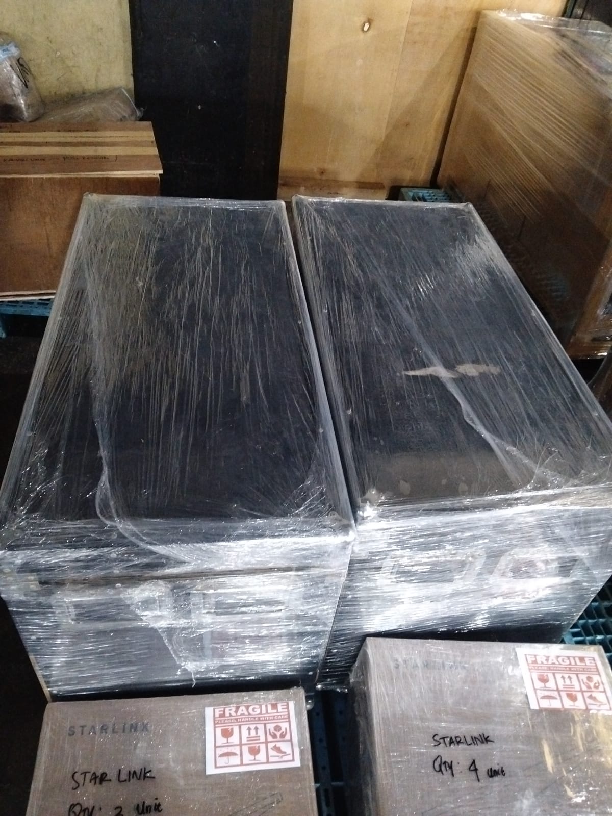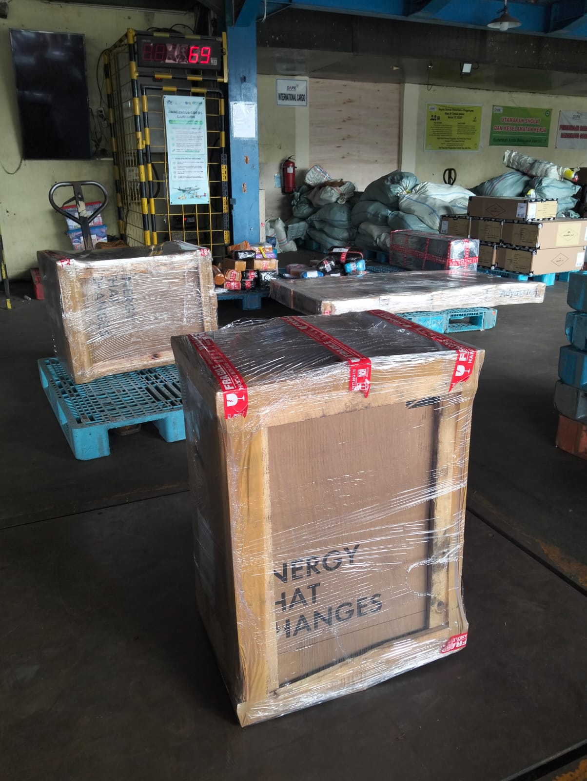 Barang berukuran besar dikemas dalam peti kayu untuk pengiriman.